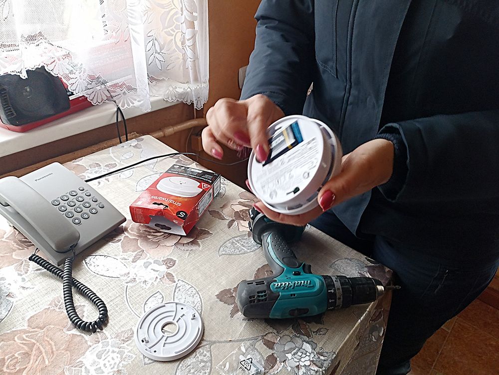 Atrodo, viskas iš pirmo žvilgsnio lyg ir gerai, tačiau specialistai senjorės namuose pasigedo dūmų detektoriaus. „Turiu dūmų detektorių, tik jis...kitam kambary, stalčiuje, nes nėra kaip prie lubų prisukti“,- aiškino E. Tatorienė. Pasirodo, nuo ilgo stovėjimo stalčiuje išsikrovusi dūmų detektoriaus baterija. Specialistai ją pakeitė nauja ir instruktavo: „Čia yra testavimo mygtukas ir reikia bent kartą per mėnesį jį paspausti, nes tik taip galima įsitikinti, ar prietaisas veikia. Jums pačiai gal ir bus sunku, bet jus lankanti darbuotoja už jus šį darbą atliks. Jei detektorius pradės po truputėlį pypsėti, neišsigąskite, reiškia, kad baterija jau į pabaigą. O jei dūmų detektorius ims skleisti šaižų, įkyrų pypsėjimą, žinokite, kad „pagavo“ dūmų ir jus įspėja apie galimą pavojų“. Paklausta, kokiu telefonu nelaimės atveju išsikviesti pagalbą, senjorė nesutriko: „Ogi 112“. Keletas minučių ir dūmų detektorius jau sėkmingai primontuotas prie gyventojos miegamojo lubų.
