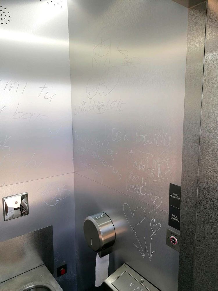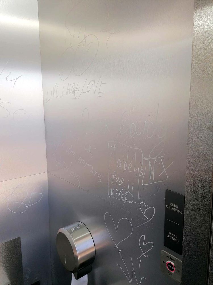 Išterliotas J. Janonio aikštės naujojo tualeto sienas penktadienio ryte rado jį prižiūrintis darbuotojas. Ant tualeto sienos buvo prirašinėta ne tik lietuviškų, bet angliškų žodžių. Žiūrint į užrašus, galima pamanyti, kad juos rašinėjęs „menininkas“ buvo visiškai susipynęs savo emocijose – vienoje vietoje angliškas žodis, reiškiantis meilę, kitoje – žodis „nekenčiu“, dar kitoje – užrašas, reiškiantis „gyvenk, mylėk, juokis“, o šalia jo – „dusk gaidy“, „tu duhas“ ir, žinoma, tradiciškai – nupieštas vyriškas lytinis organas.