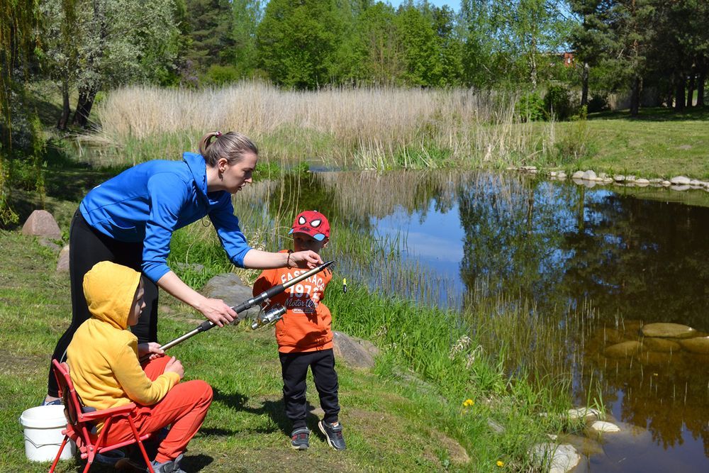 Simpatiška mamytė Samanta vyresnėlį Tomą prie Apaščios upės moko žvejoti. Pamokėles stebi mažasis broliukas Adamas.