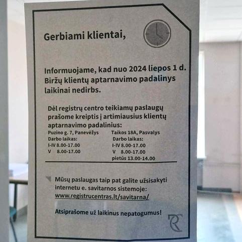 Ant savivaldybės pastato stiklinių durų kabo informacinis lapelis, kuriame nurodoma, kad Biržų klientų aptarnavimo padalinys nuo liepos 1 dienos laikinai nedirbs, o dėl „Registrų centro“ teikiamų paslaugų gyventojų prašoma kreiptis į artimiausius klientų aptarnavimo padalinius – Panevėžyje ir Pasvalyje arba pasinaudoti internetine e.savitarnos sistema.