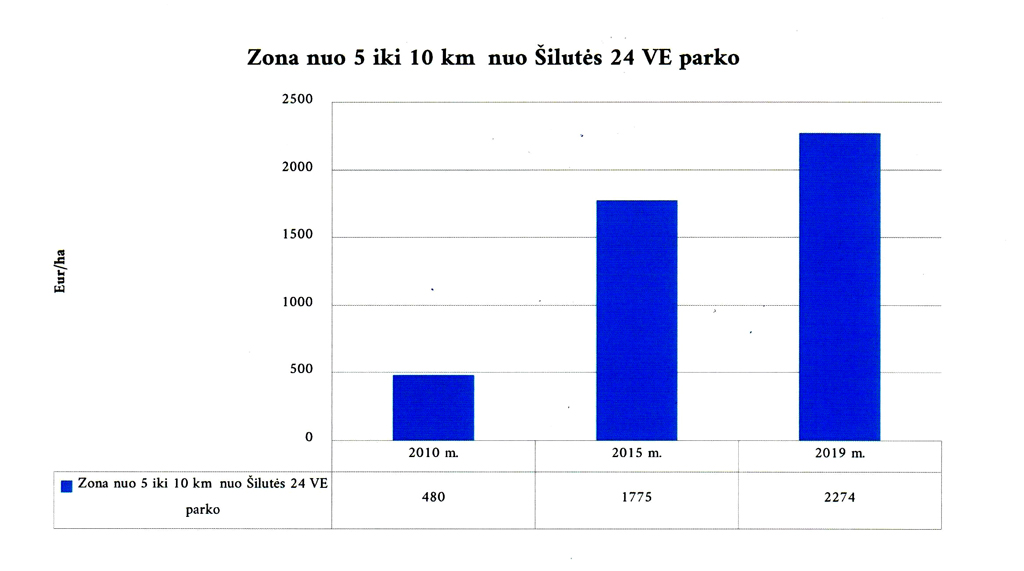 Jeigu tuos kainų augimus paversime procentais, tai, pavyzdžiui, Šilutėje, kur vėjo elektrinių parkas buvo pradėtas eksploatuoti 2016 m., augimas yra toks: vėjo elektrinių parko teritorijoje kainos išaugo 290 proc.; iki 5 km nutolusioje zonoje jos pakilo 196 proc., o 5-10 km nutolusioje zonoje – 374 proc. Įspūdingi Šilalės procentai: 2010 m. žemės kaina vėjo elektrinių parko teritorijoje viršijo kainas Lietuvoje 520 proc., o 2019 m. – 218 proc.