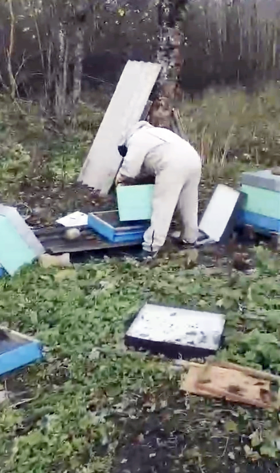 „Viename bityne radome du nuverstus avilius, kitame – penkis. Vienas avilys buvo tuščias, gal vieno avilio šeima dar išgyvens, o penkios bičių šeimos žuvo. Avilių dalys buvo išmėtytos, išplėšyti ir išgraužti koriai. Manome, kad joks kitas žvėrelis taip negalėjo padaryti, žmogus taip pat – ne. Labai panašu, kad tai – meškos darbas. Labiausiai gaila bičių šeimų. Išvartytus avilius vėl sustatėme, sutvarkėme ir galėsime toliau naudoti”,- sakė A. Milkerienė.
