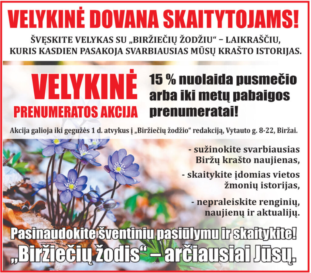 „Biržiečių žodžio“ prenumerata PRIIMAMA: „Biržiečių žodžio“ redakcijoje Vytauto g. 8-22, Biržai,