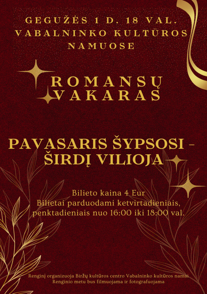 Gegužės 1 d. 18 val. – Vabalninko kultūros namuose romansų vakaras „Pavasaris šypsosi – širdį vilioja“. Trukmė – 1 val. 30 min. Bilieto kaina – 4 Eur.