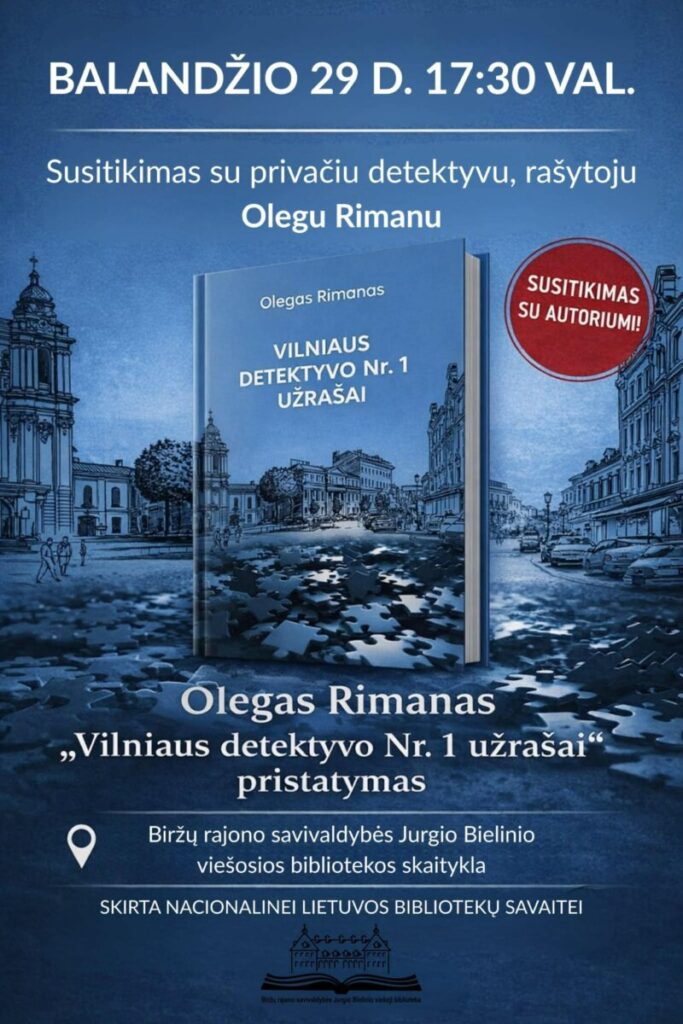 Balandžio 29 d. 17.30 val. susitikimas su privačiu detektyvu, rašytoju Olegu Rimanu. Autorius pristatys naujausią savo knygą „Vilniaus detektyvo Nr. 1 užrašai“. Tai kvietimas pažvelgti į tyrėjo profesiją be filtrų ir Holivudo dekoracijų.