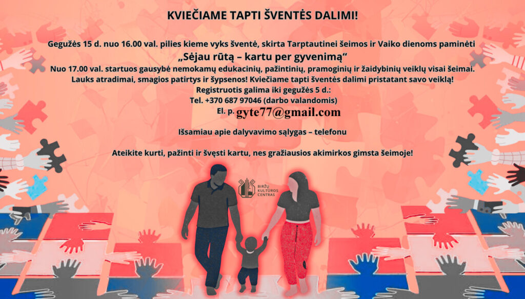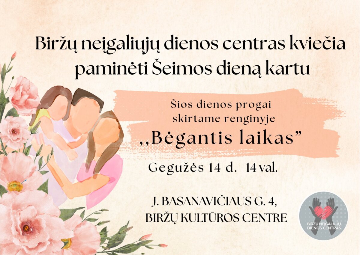 Gegužės 14 d. 14 val. – Biržų rajono socialinių paslaugų centro, neįgaliųjų dienos centro renginys, skirtas Tarptautinei šeimos dienai „Bėgantis laikas“. Trukmė – 1 val. Renginys nemokamas.