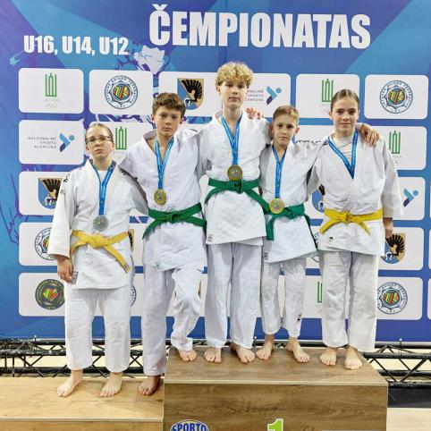 Biržų rajono sporto centro auklėtiniai (iš kairės) Augustė Žvalionytė, Ovidijus Remeika, Dominykas Dermauskas, Domantas Bartuškevičius ir Naomi Skaburskytė lipo ant aukščiausių apdovanojimų pakylos.