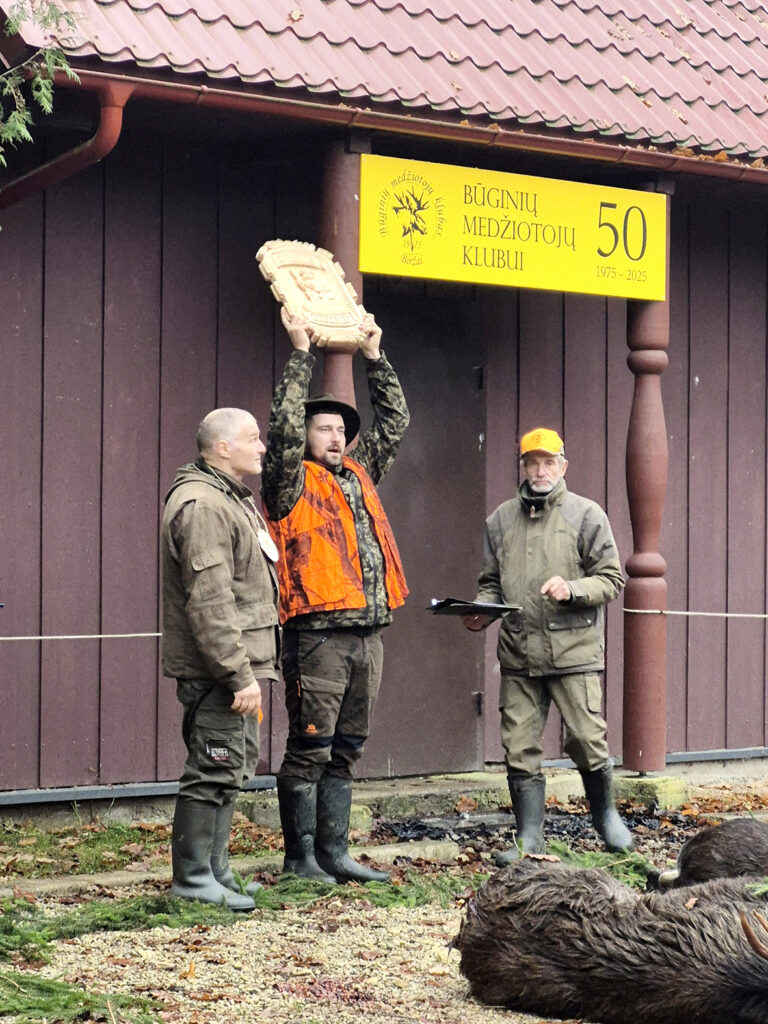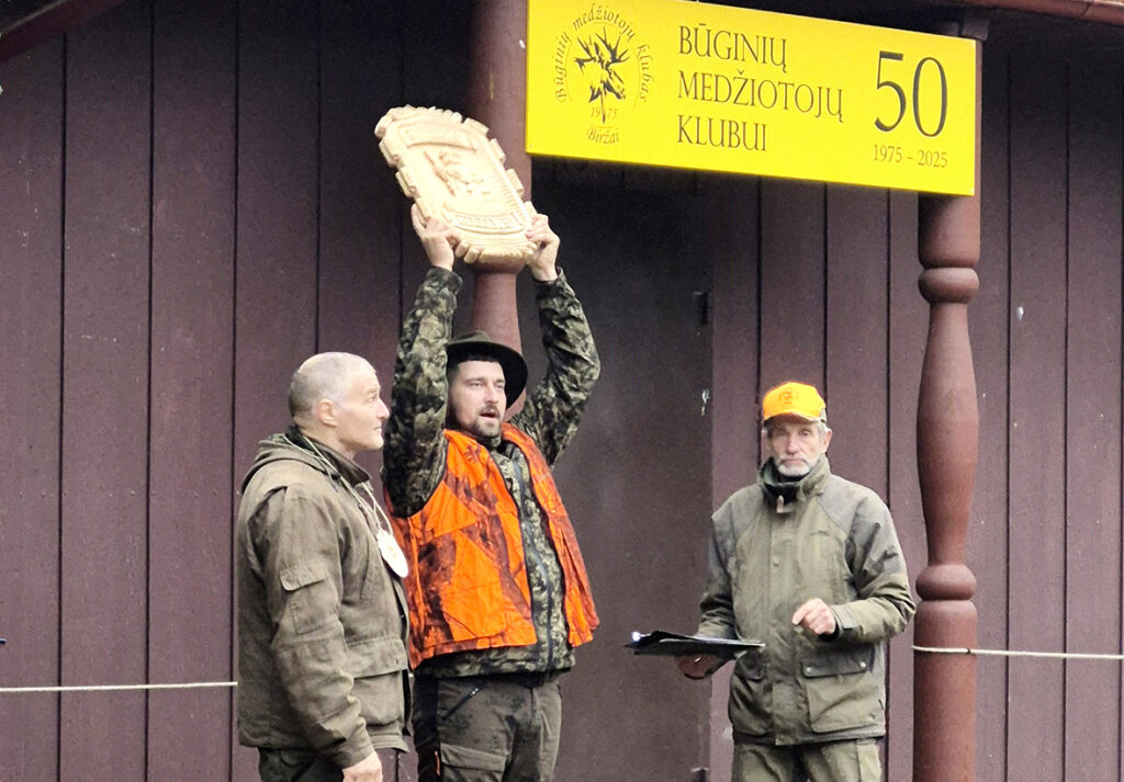 Pagrindinį pereinamąjį prizą ir medžioklės karaliaus titulą šiemet pelnė kviestinis svečias iš Zarasų rajono – Vygantas Cibulskis (kairėje), kuriam prizą įteikė „Baublio“ grupės vadovas Tautvydas Marcinkevičius (viduryje).