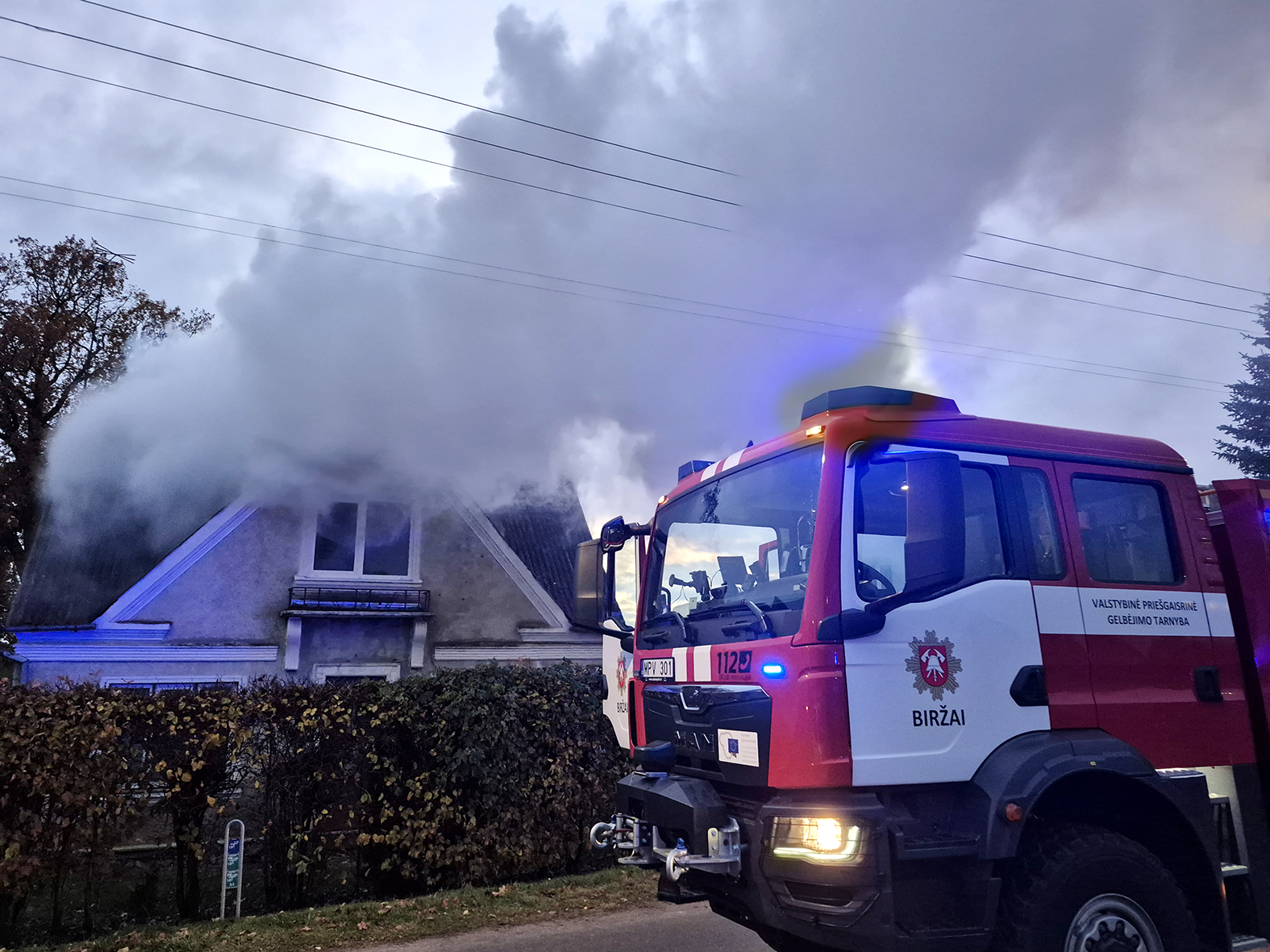 Ugniagesiams atvykus į įvykio vietą, mūrinis vieno aukšto su mansarda namas degė atvira liepsna.