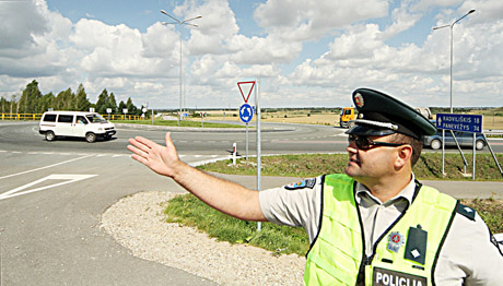 SANKRYŽA: Kelių policijos biuro Kelių patrulių kuopos I-ojo būrio specialistas Edgaras Kiaušinis įsitikinęs, kad vairuotojai žino eismo tvarką prieš žiedinę sankryžą ir joje. Nepaisant to, pažeidimai tokiose sankryžose dažni.